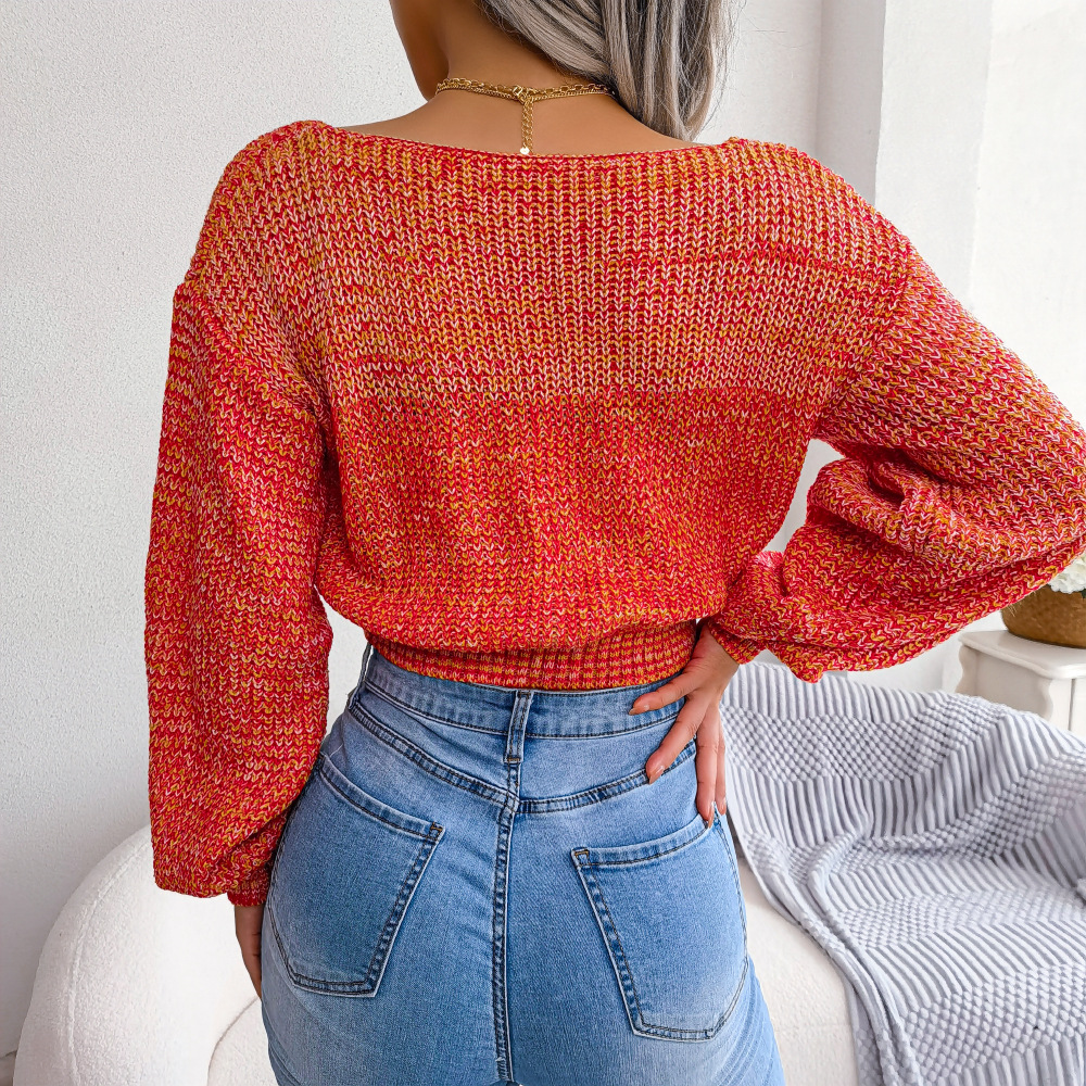 Autumn Winter Color Cross V neck Lantern Sleeve cropped Sweater Women Clothing