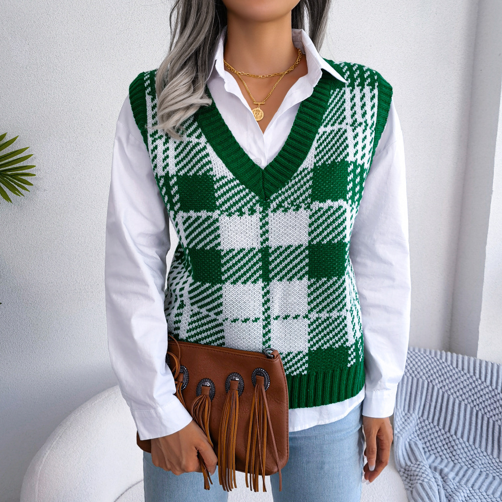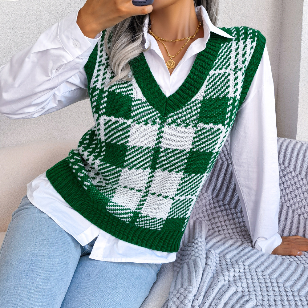 Autumn Winter Leisure Color Contrast Check Knitted Vest Sweater Vest Women Clothing