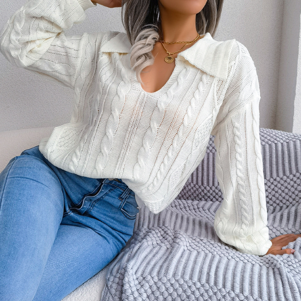 Autumn Winter Leisure Lapel Twist Lantern Sleeve Knitted Sweater Women Clothing