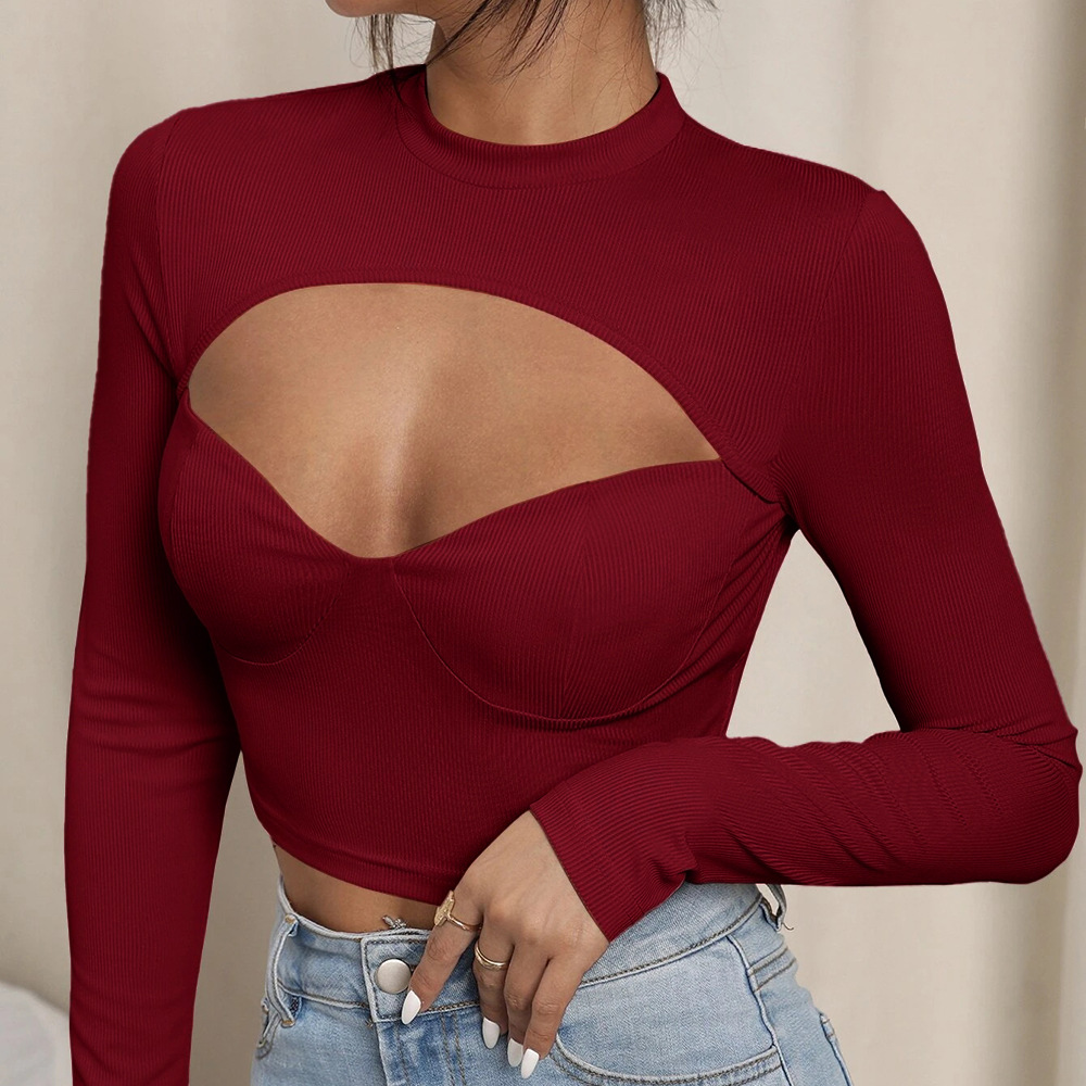 Autumn Winter Sexy Slim Hollow Out Cutout Chest Cup Type High Collar Short Section Long Sleeve Women T-shirt Tops Women