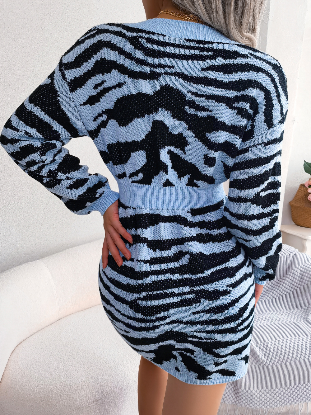 Autumn Winter Tiger Pattern Lantern Sleeve Waist Tight Woolen Women Clothing
