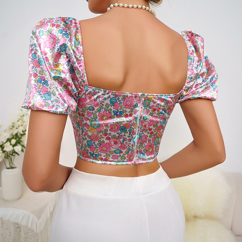 French Puff Sleeve Printed Top with Steel Ring Push up Waist Boning Corset Corset Outer Wear Short Corset Vest