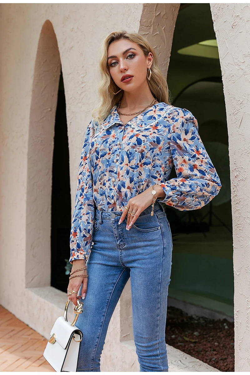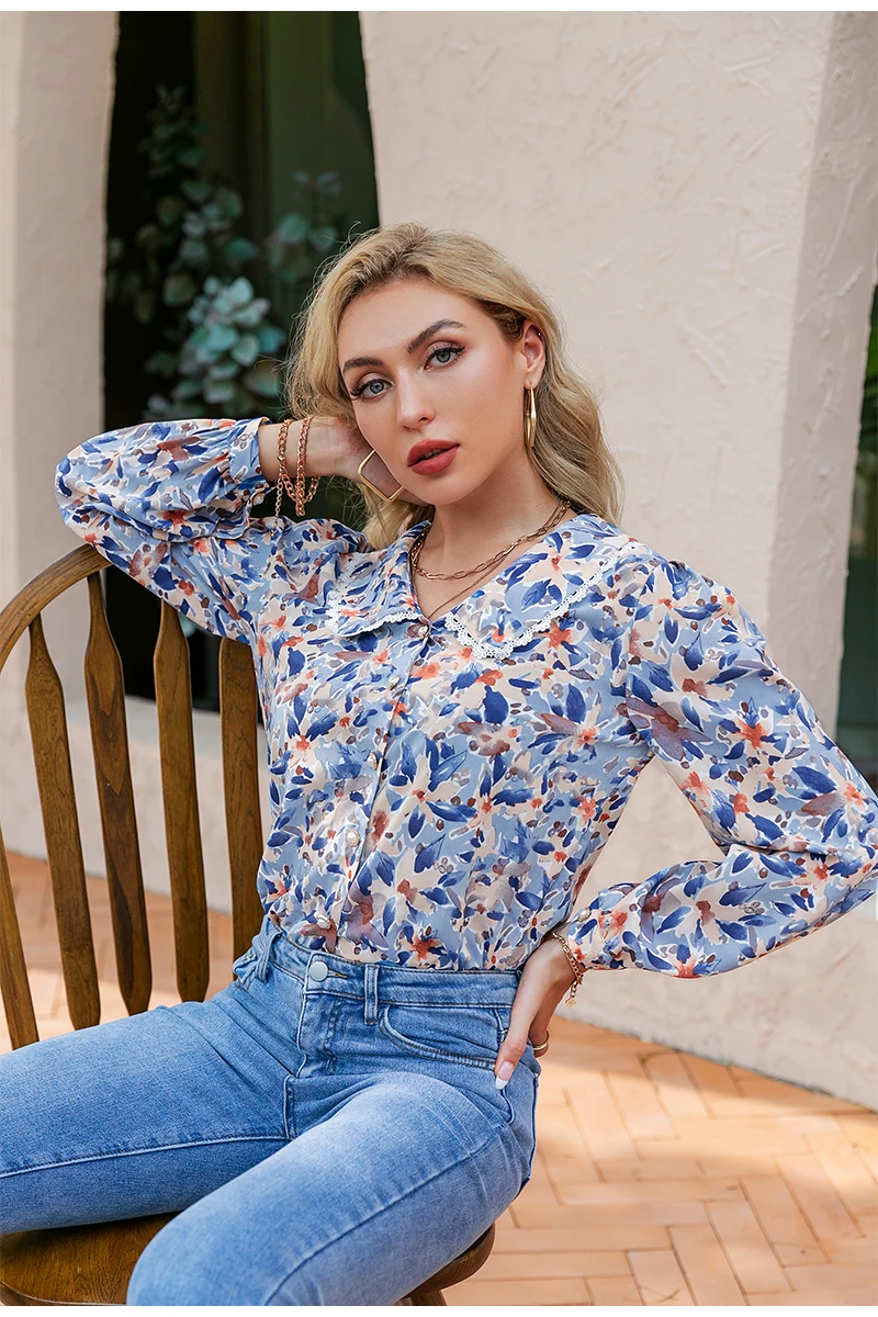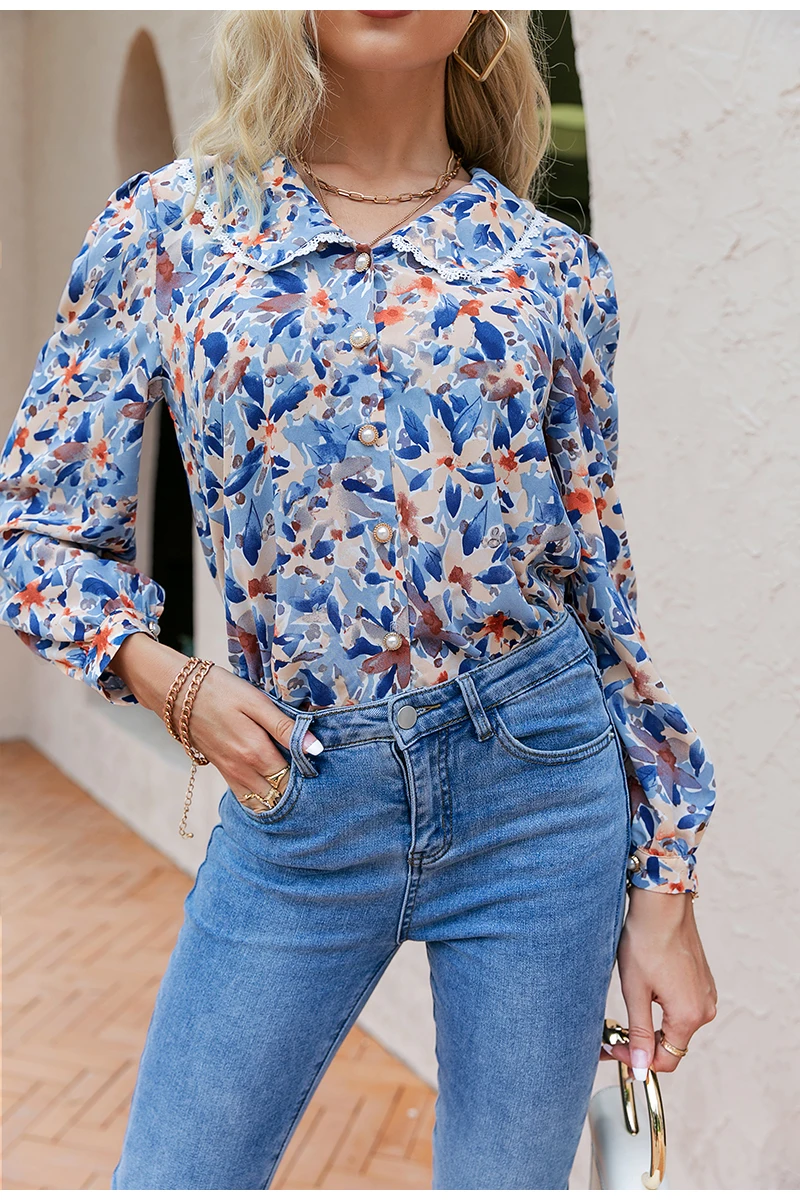 Holiday Floral Peter Pan Women Shirt Blue Bohemia Button Autumn Blouse Shirt Short Retro Casual Ladies Tops