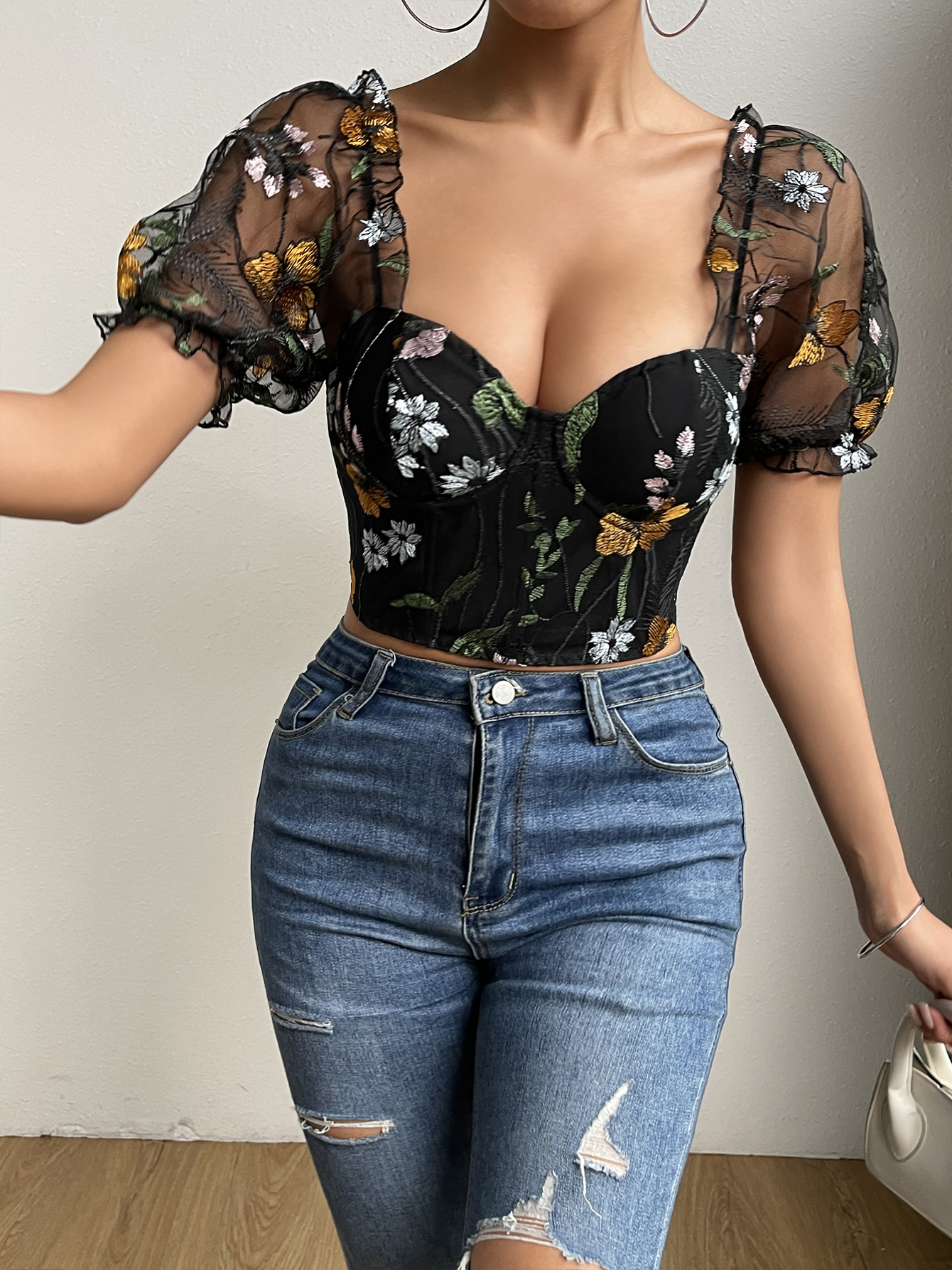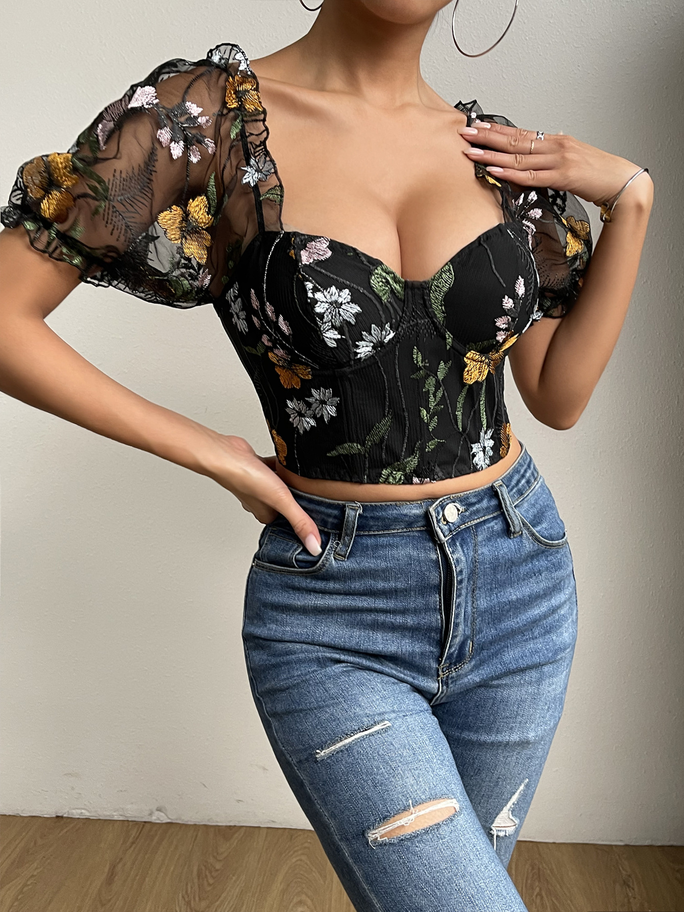 Mesh Floral Embroidered Breasted Puff Sleeve Boning Corset Short Slim Fit Sexy Top