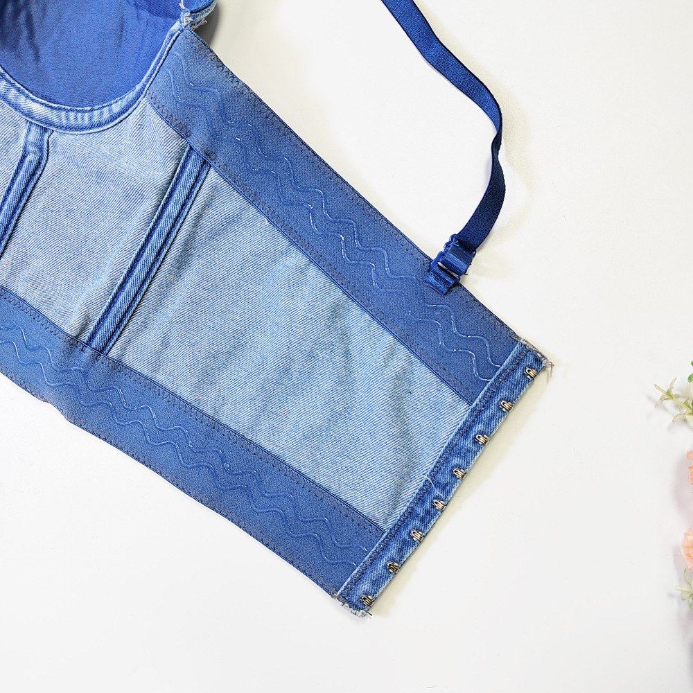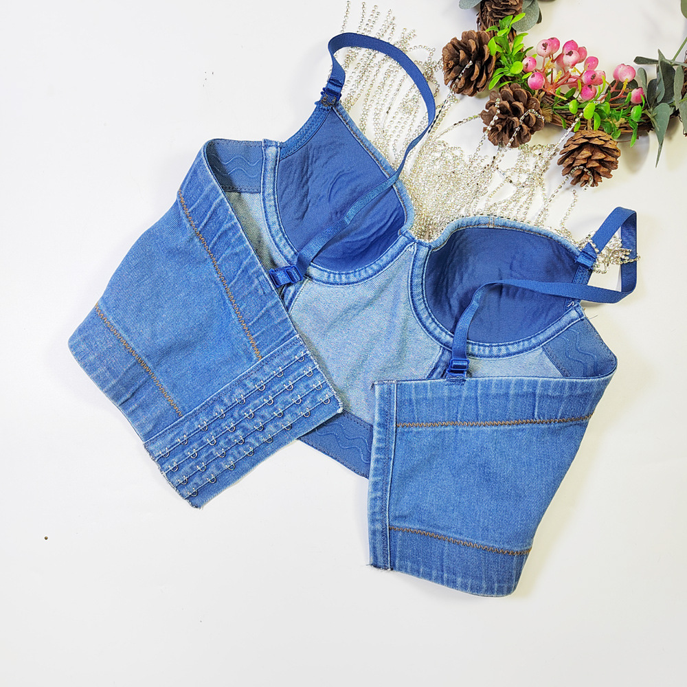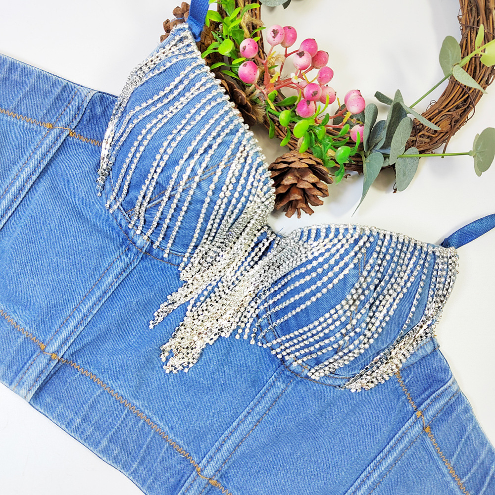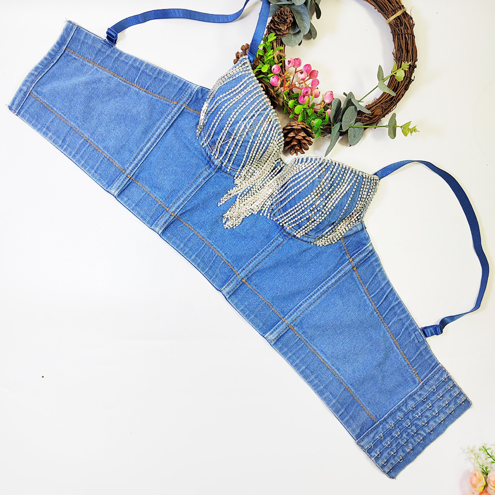 Sexy Denim Tube Top with Chest Pad Short Sleeveless Body Shaping Top Rhinestone Tassel Boning Corset Corset