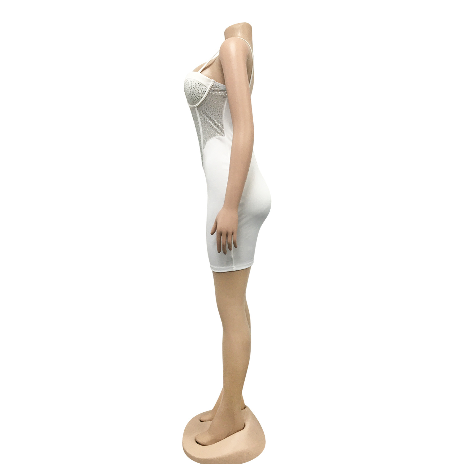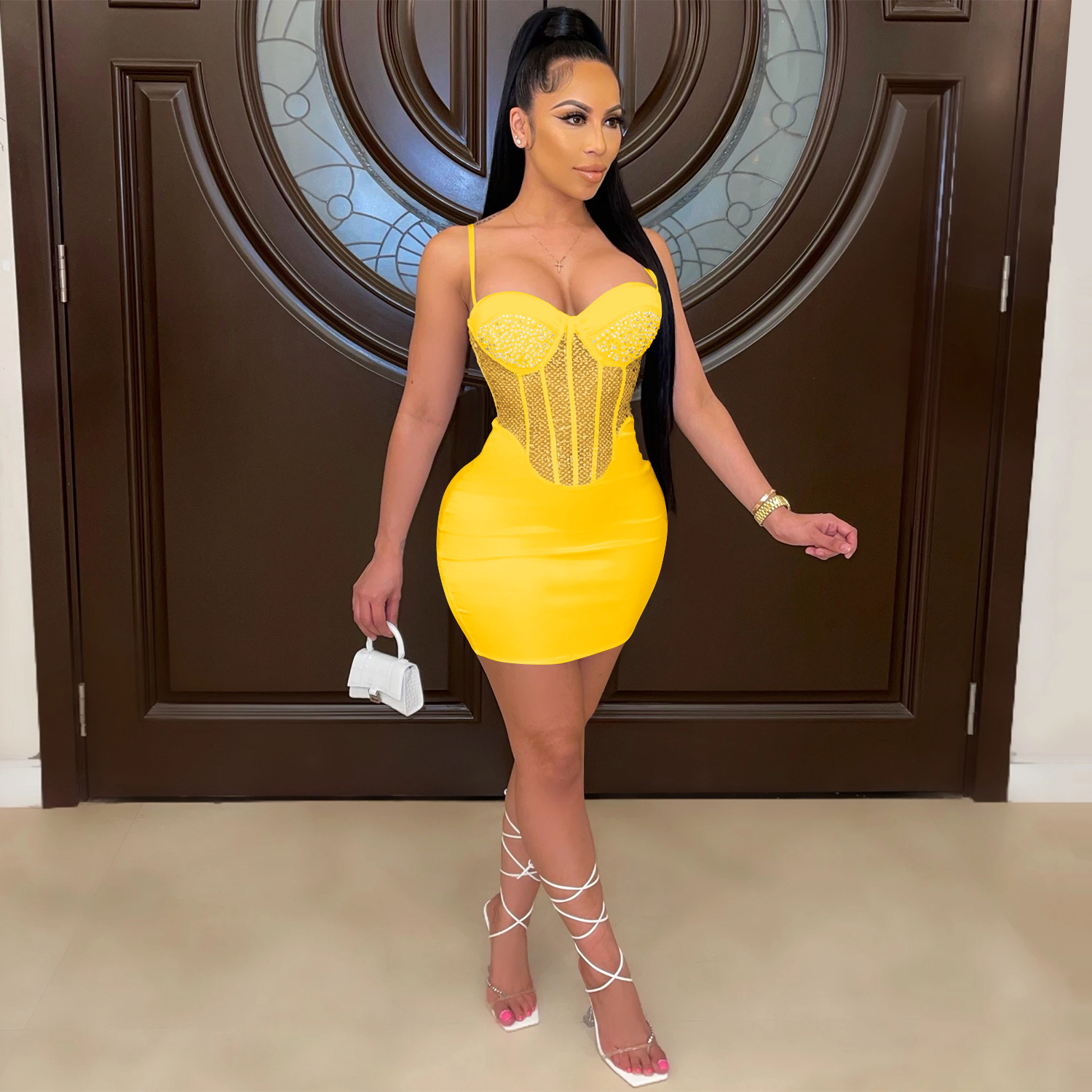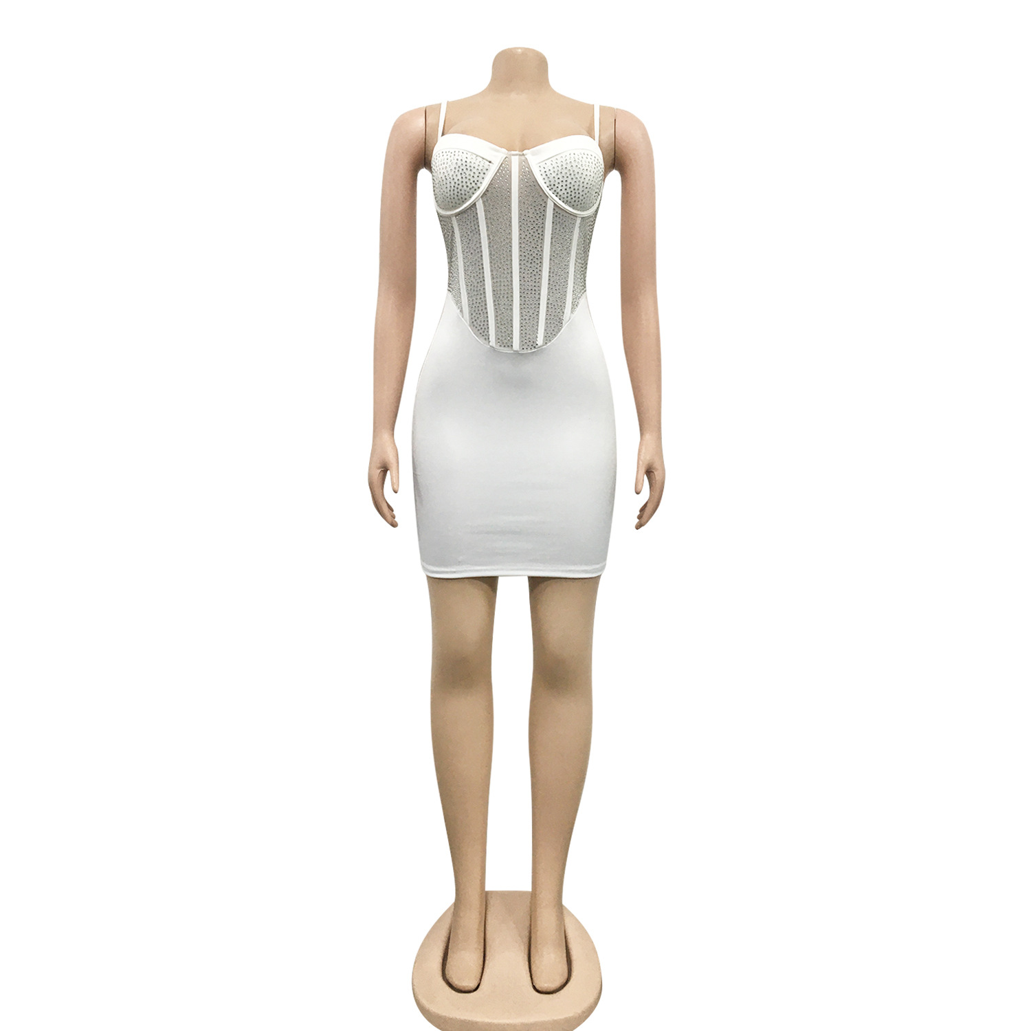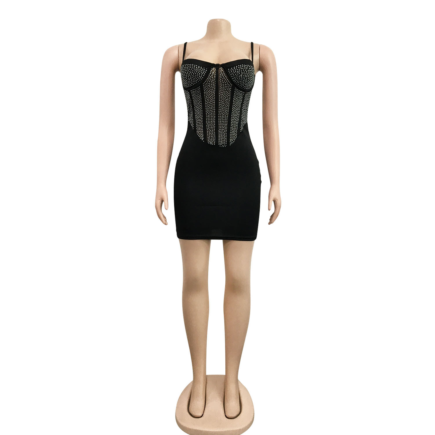 Sexy Spaghetti Straps Corset Mesh Drilling Solid Color Dress