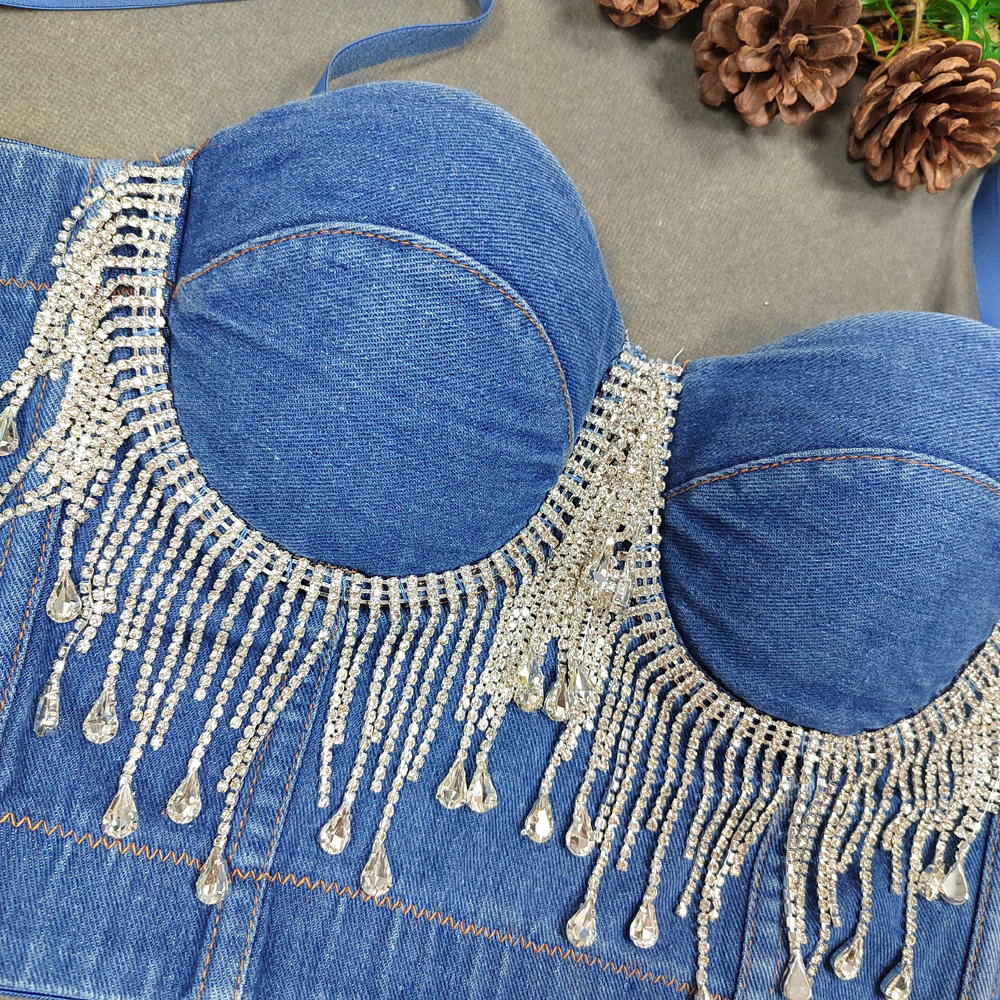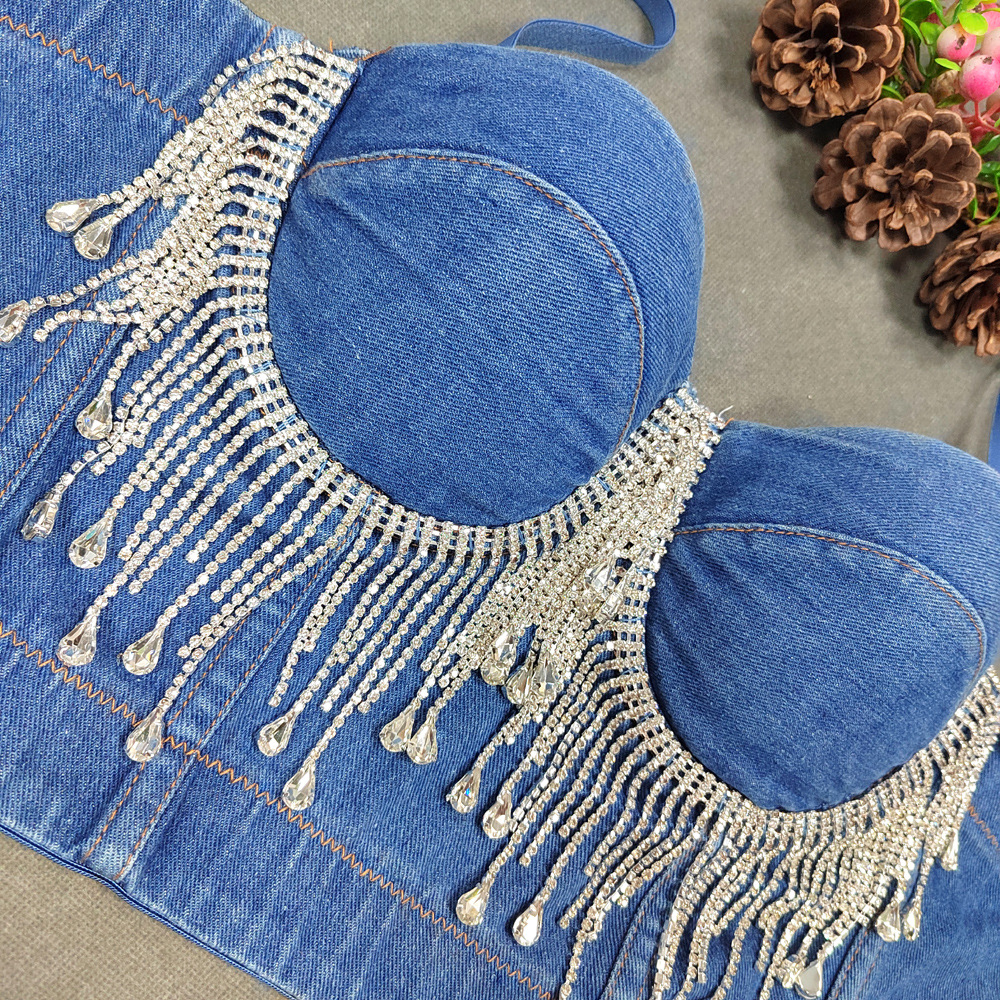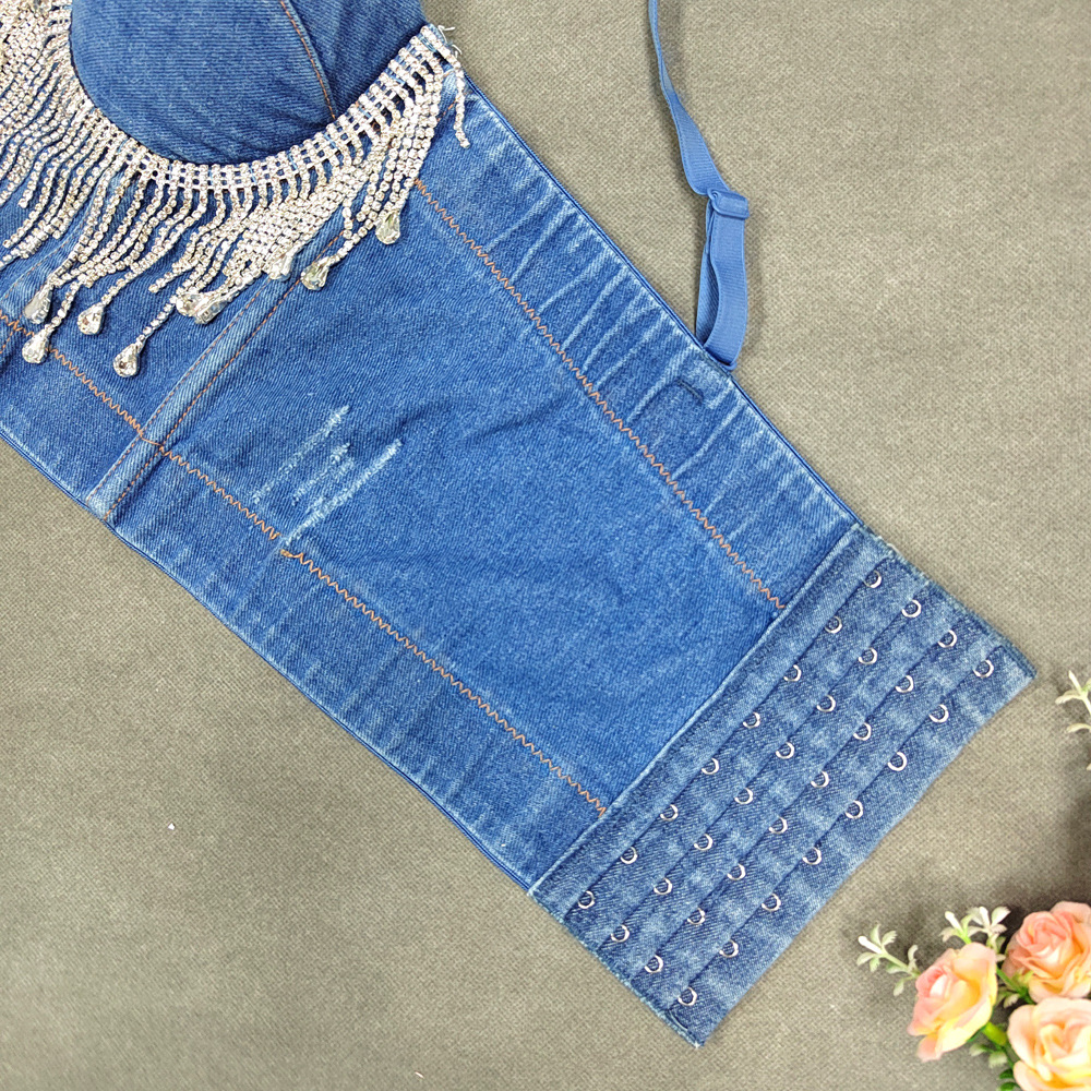 Slim Denim Corset Stitching Rhinestone Tassel Beaded Boning Corset Strap Nightclub Rock Wind Wrapped Chest