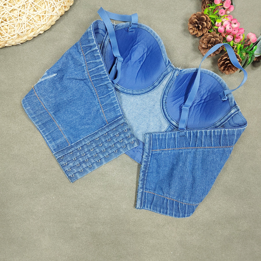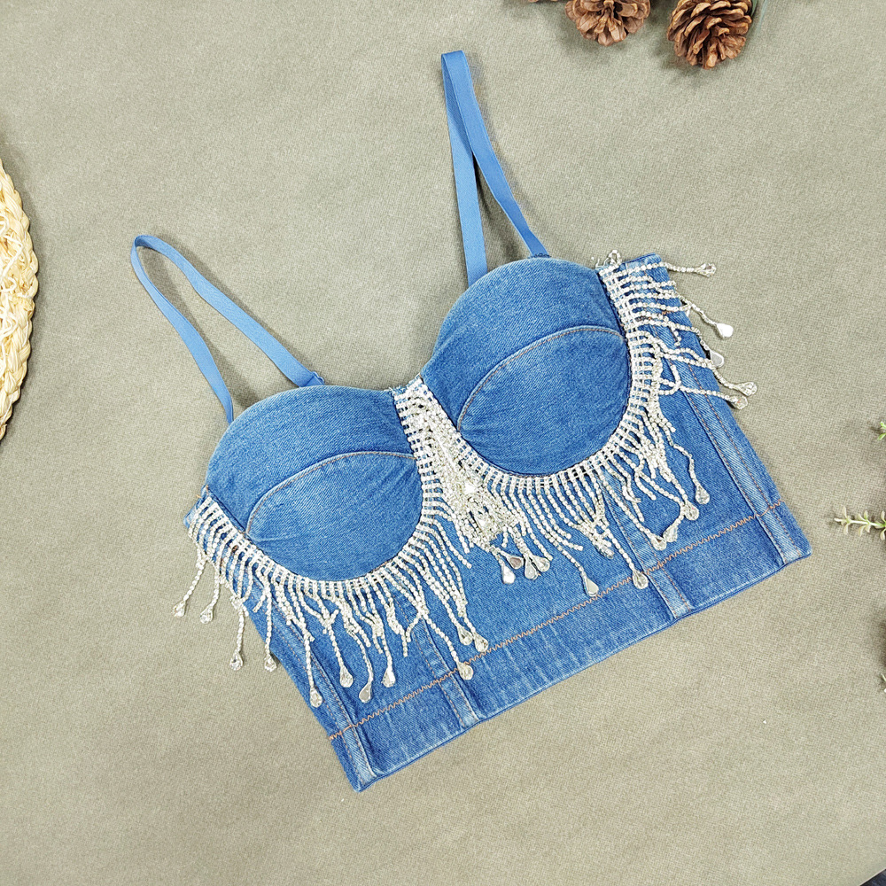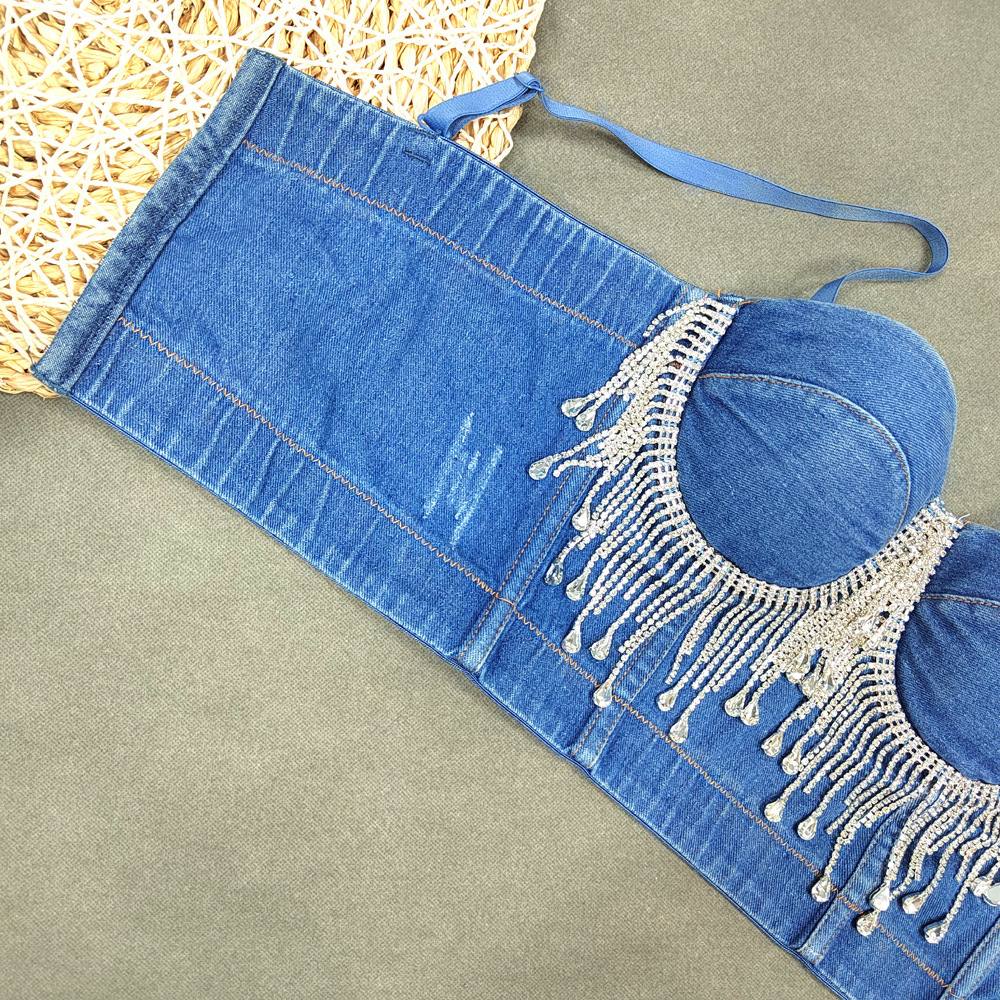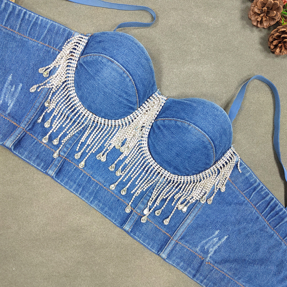 Slim Denim Corset Stitching Rhinestone Tassel Beaded Boning Corset Strap Nightclub Rock Wind Wrapped Chest
