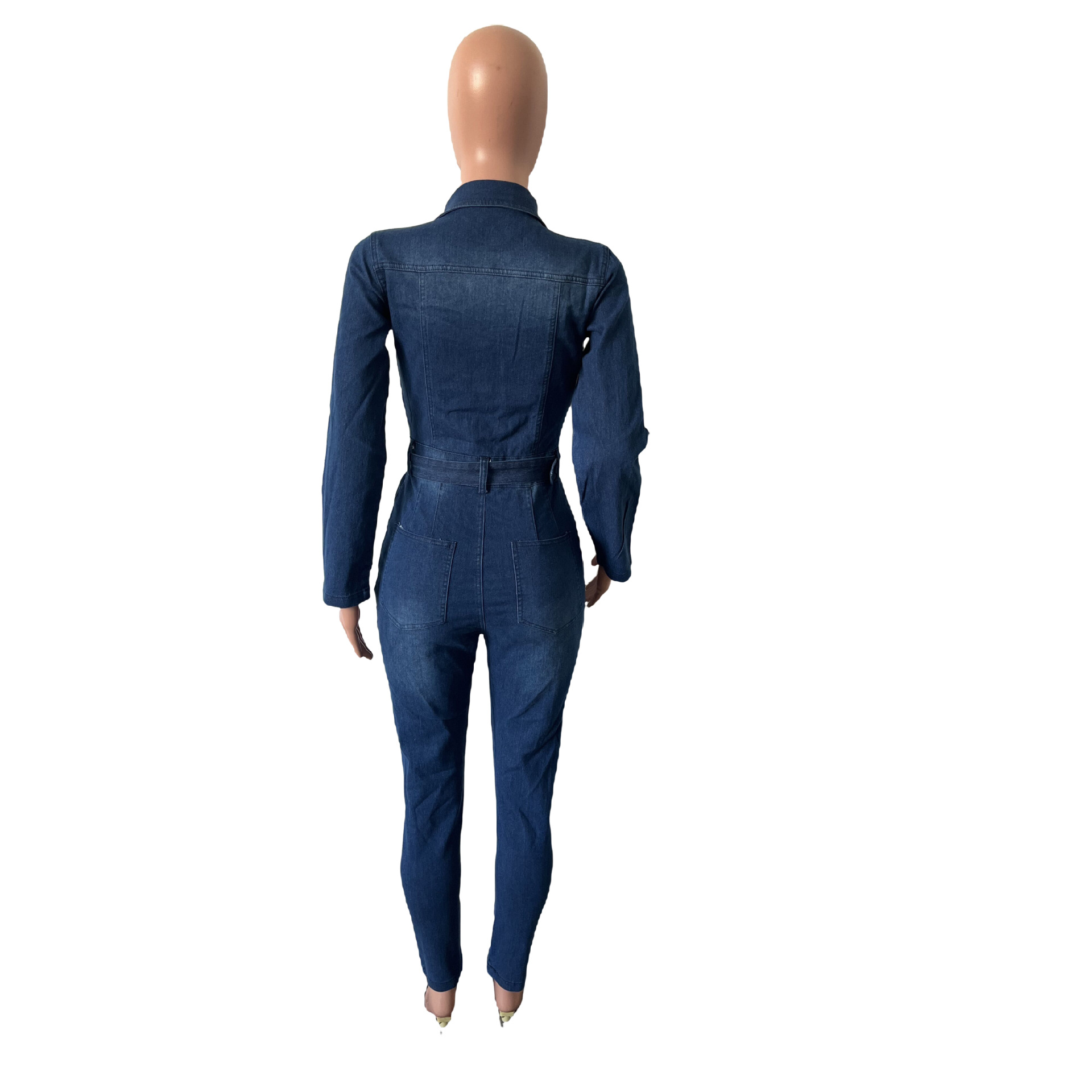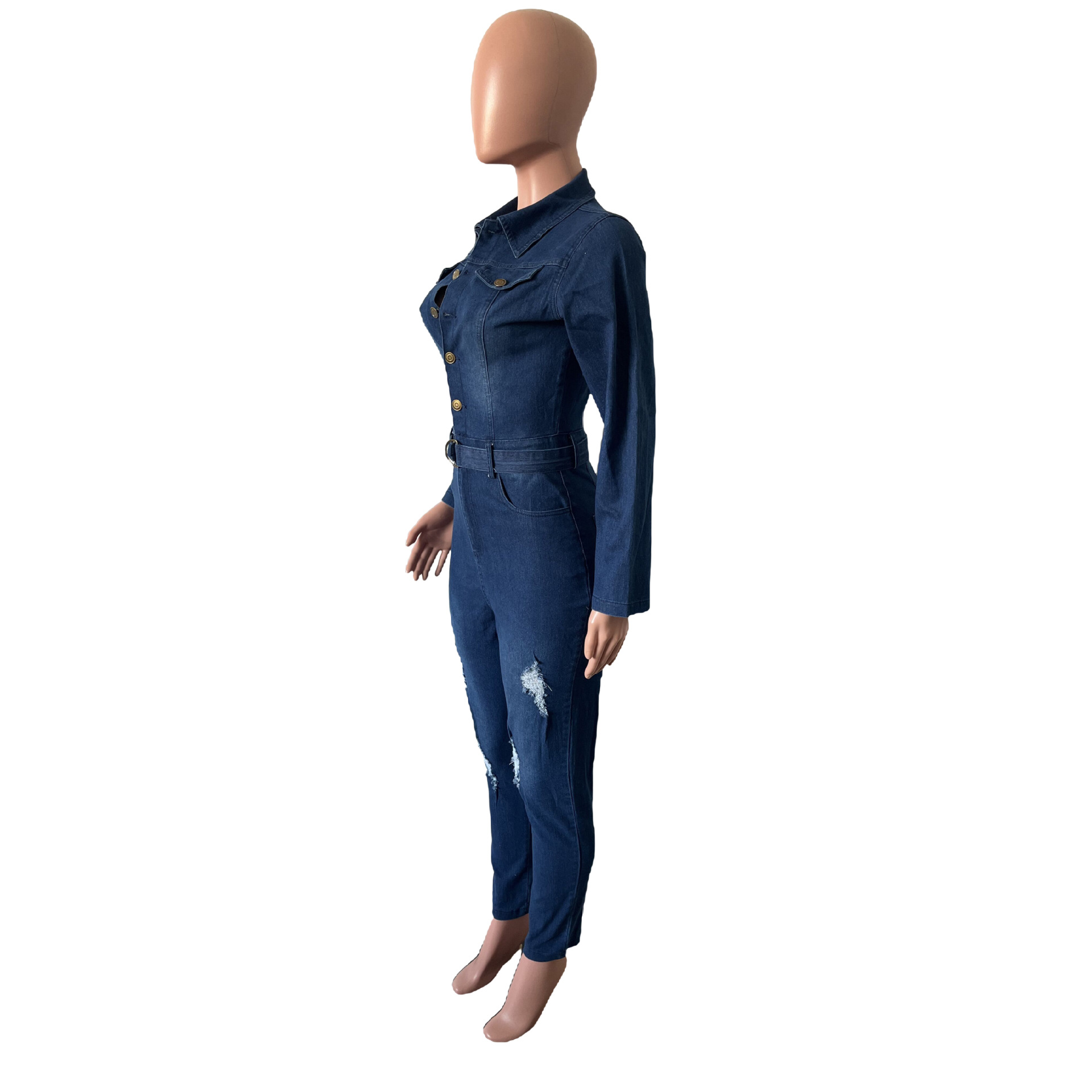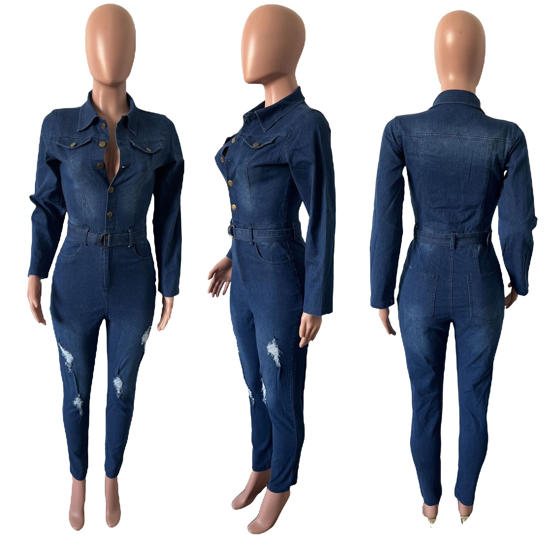 Slim Elastic Tight Ripped Washed Long Sleeve Denim Jumpsuit Jumpsuit