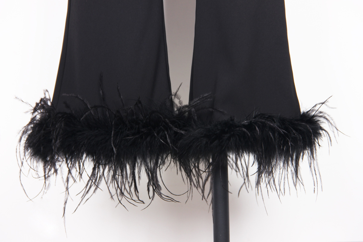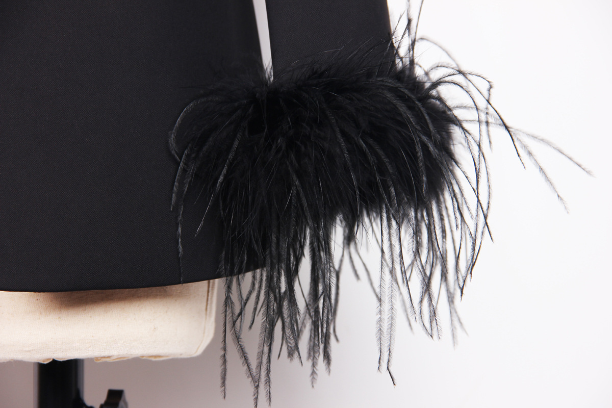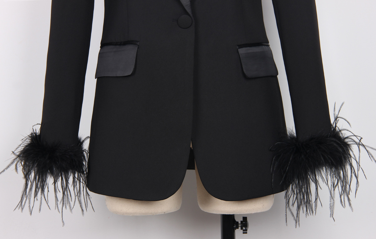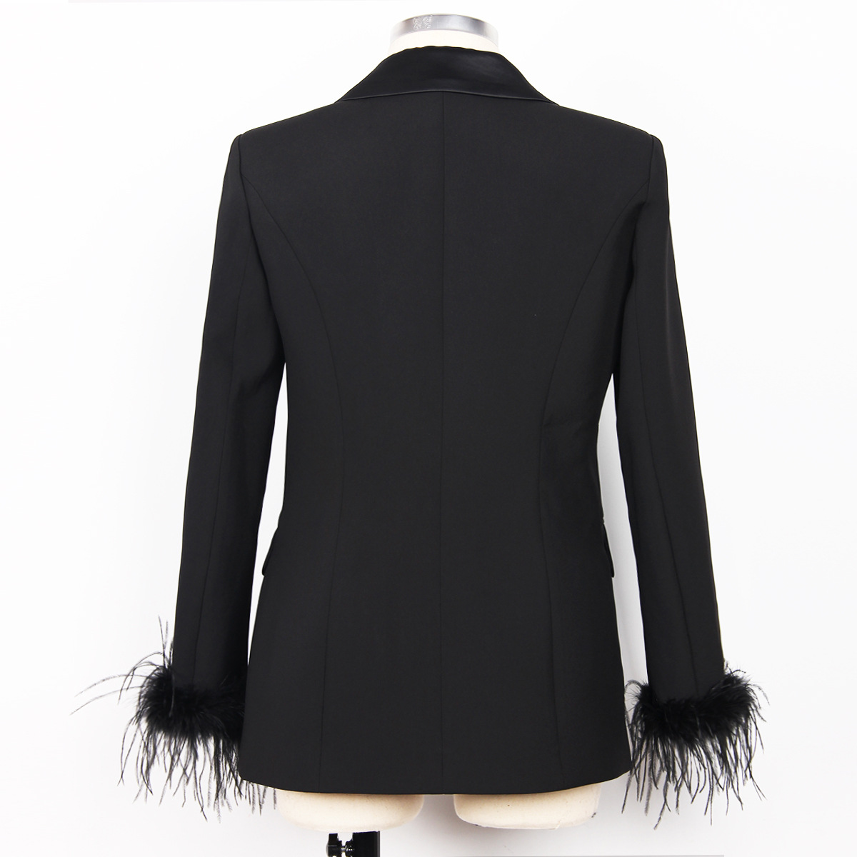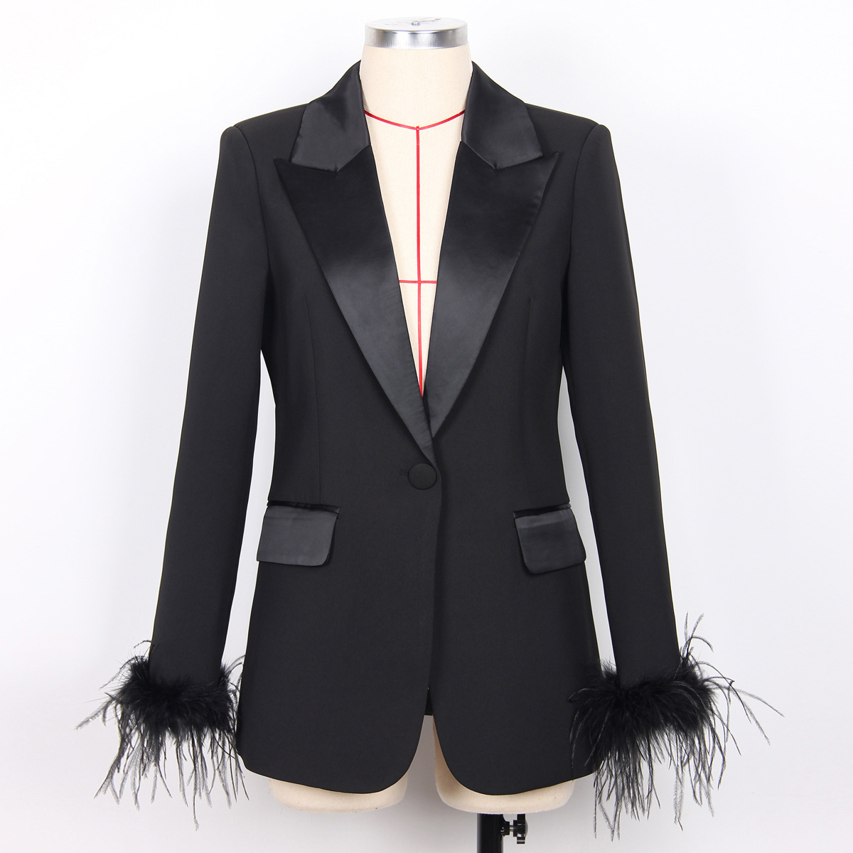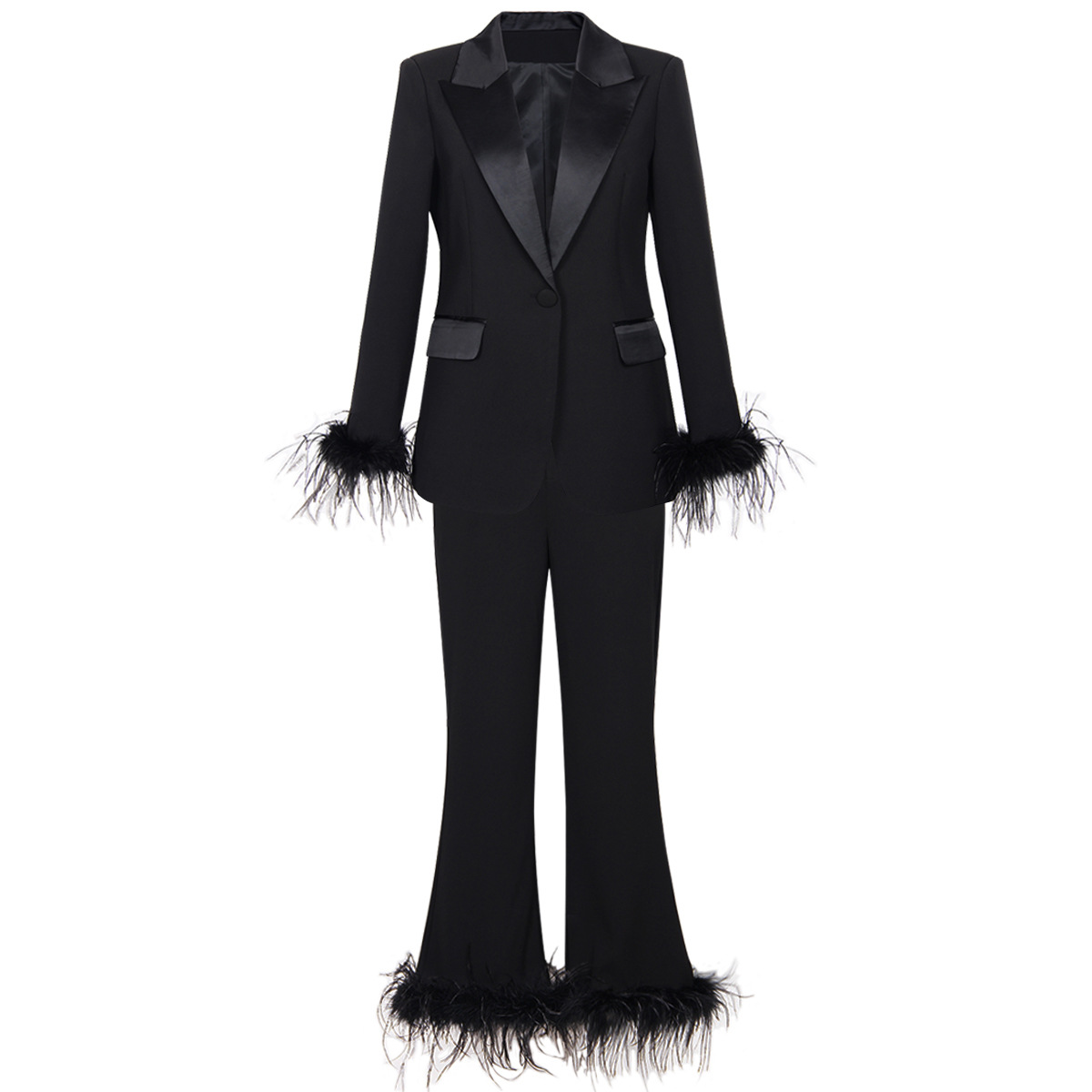 Spring Autumn Ostrich Fur Satin Collar Women Blazer Business Elegant Business Work Pant Set