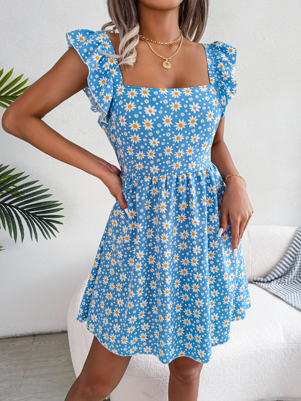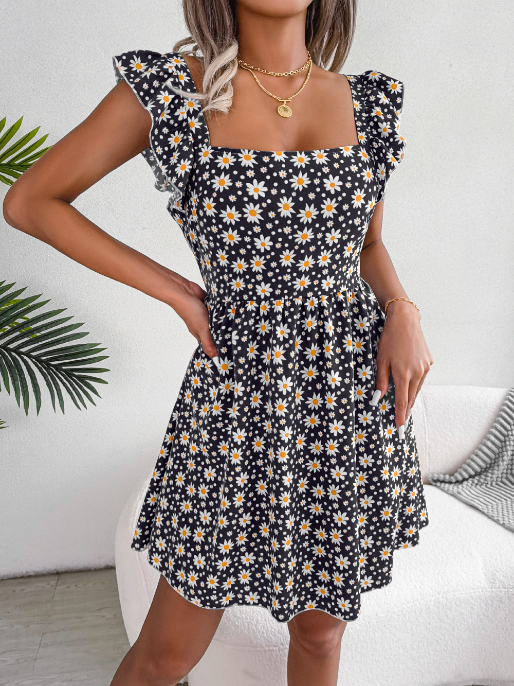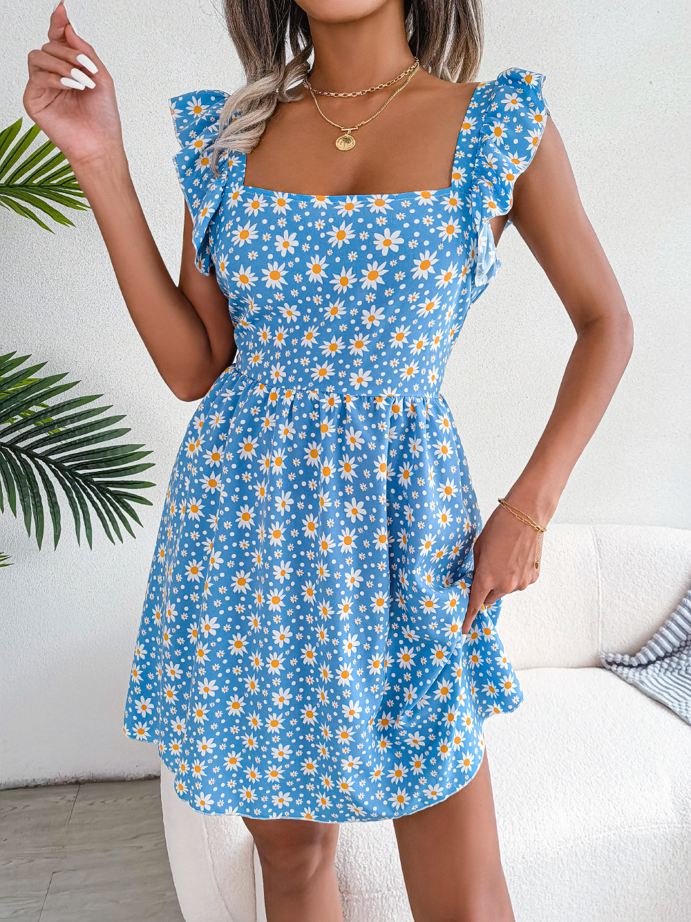 Spring Summer Backless Lace-up Daisy Print Casual Holiday Dress Women Clothing