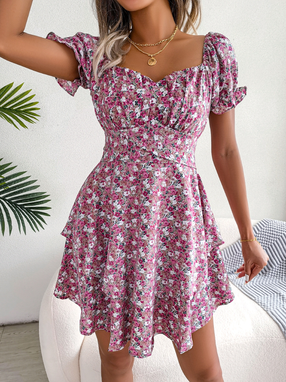 Spring Summer Elegant Floral Lace-up Waist-Controlled Large Hem Dress Women Clothing