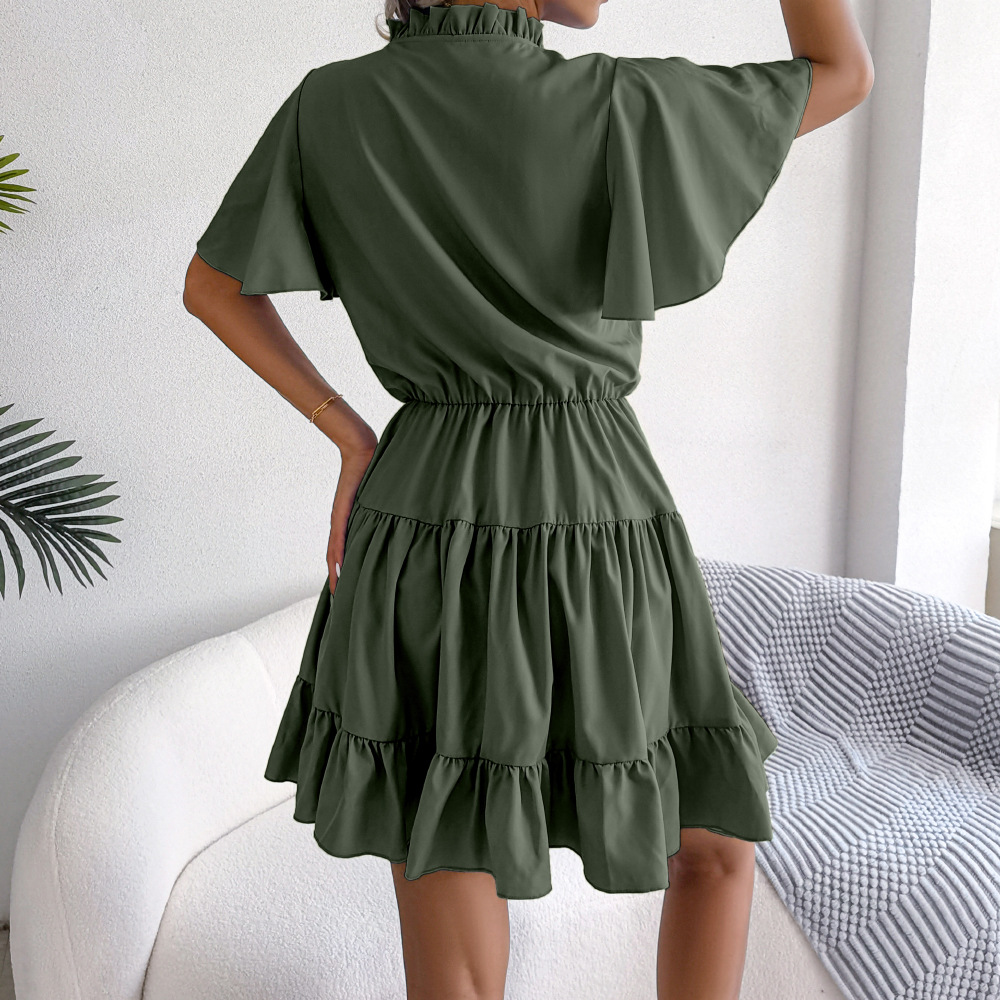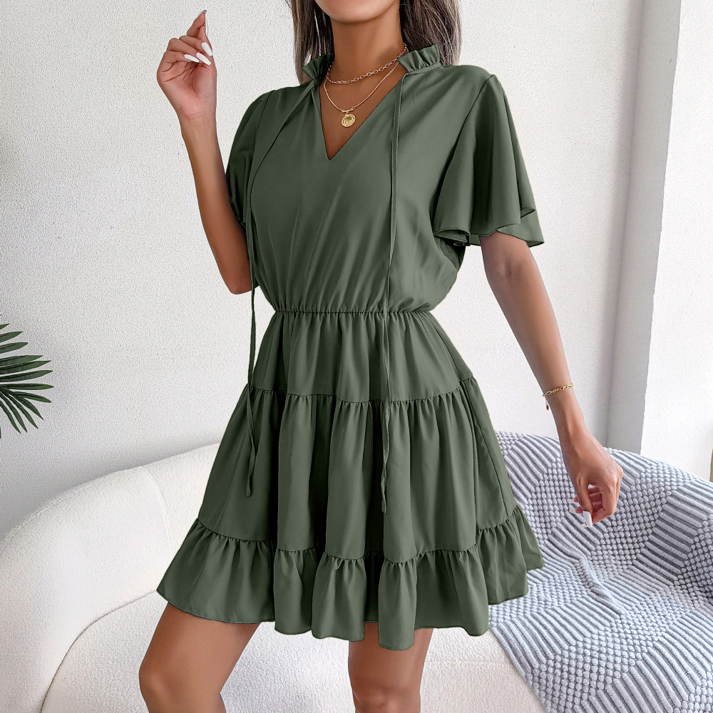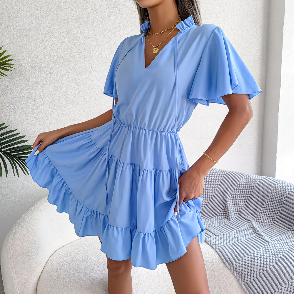 Spring Summer Flounced Ribbon Big Hem A- line Solid Color Dress Women Clothing