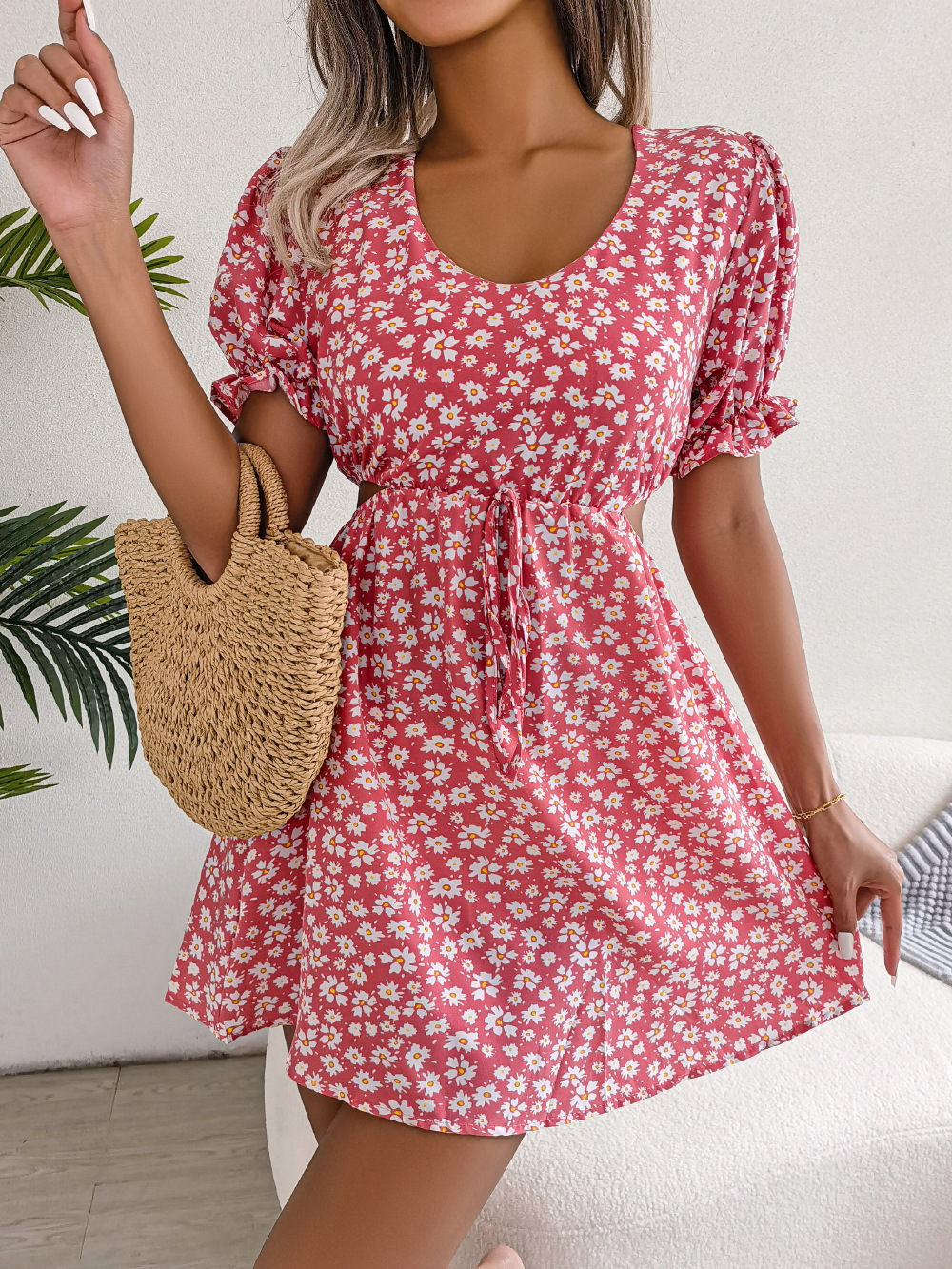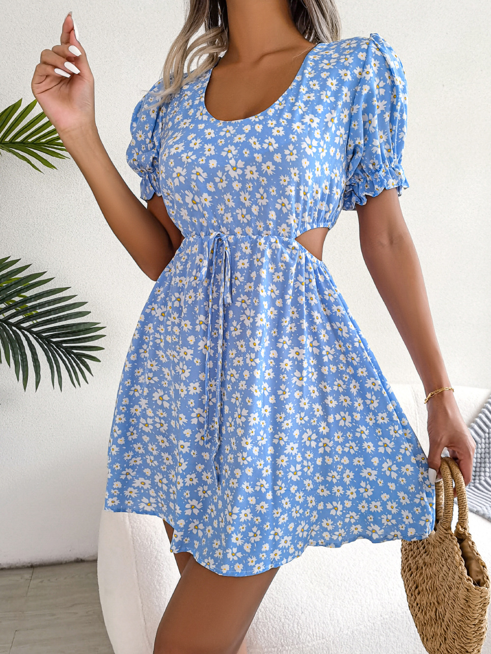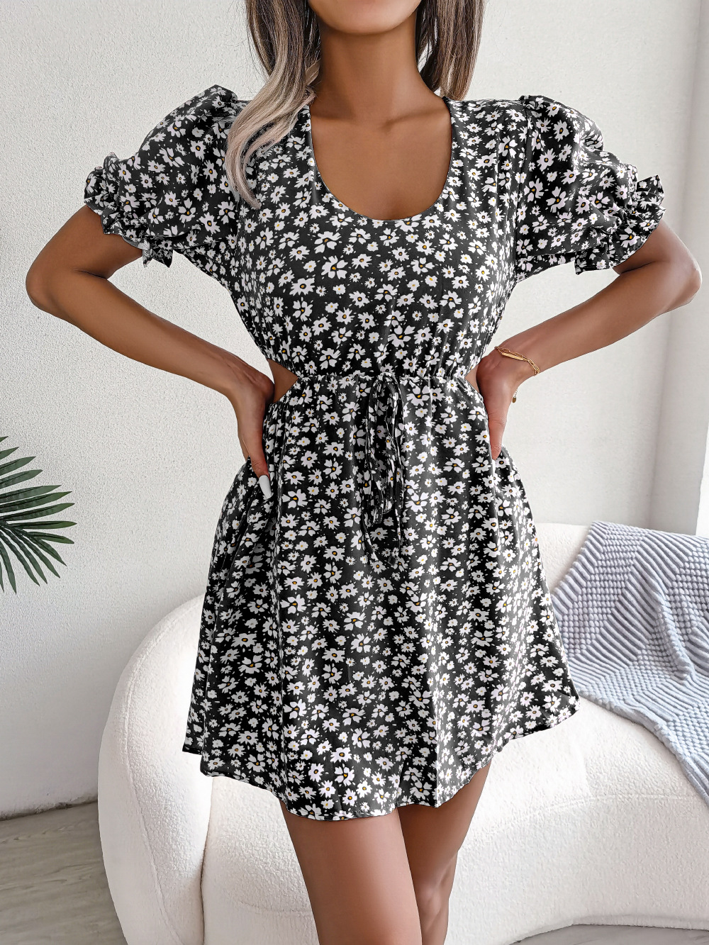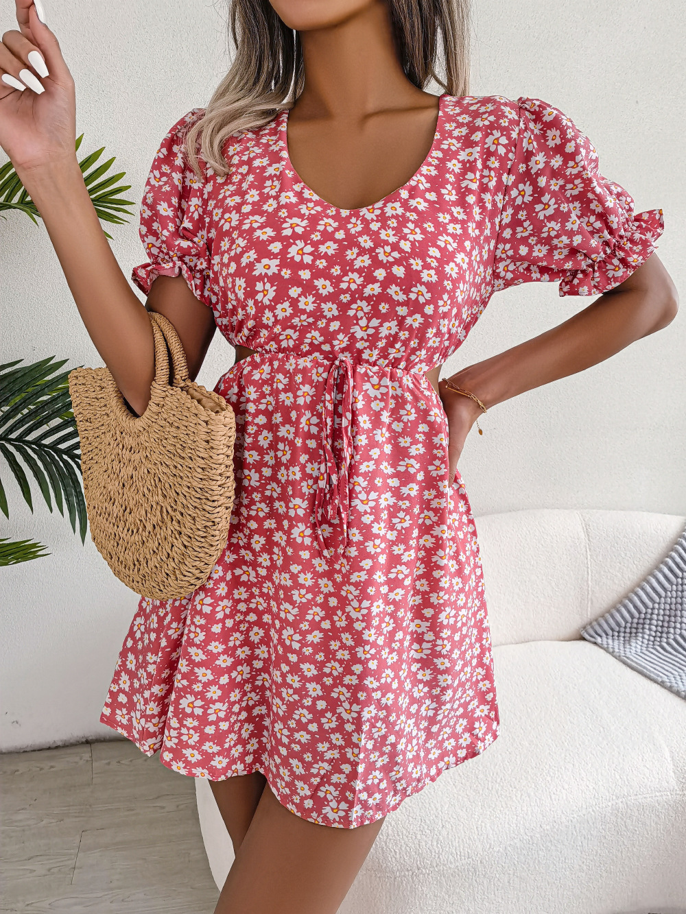 Spring Summer Leisure Hollow Out Cutout out Tied Short Sleeve Floral Dress Women Clothing