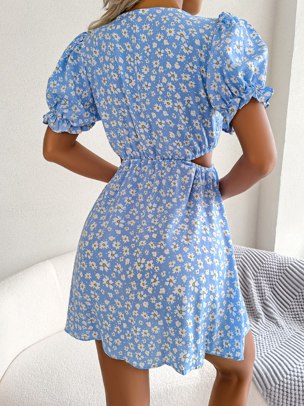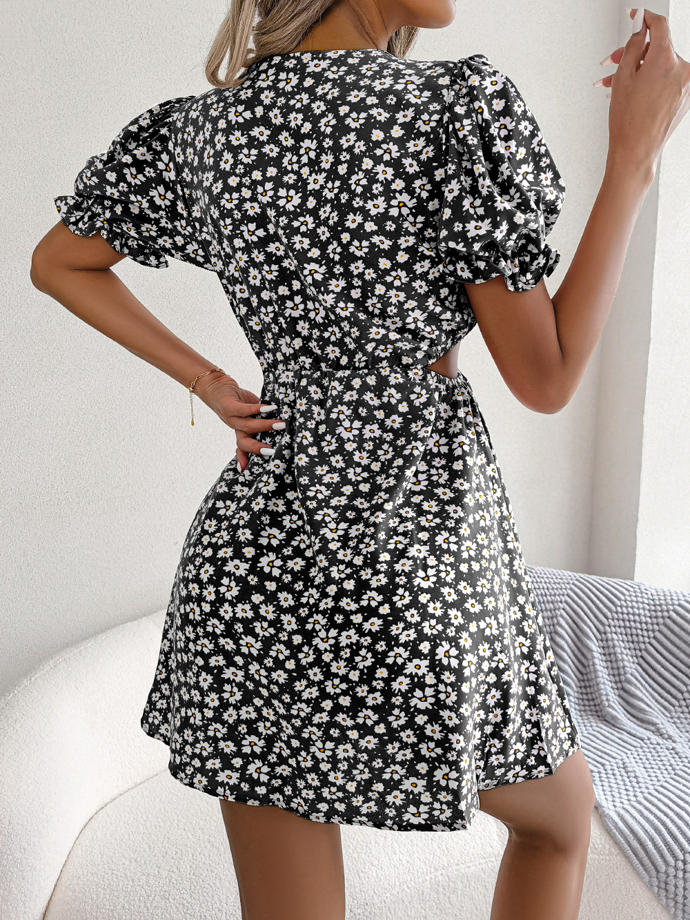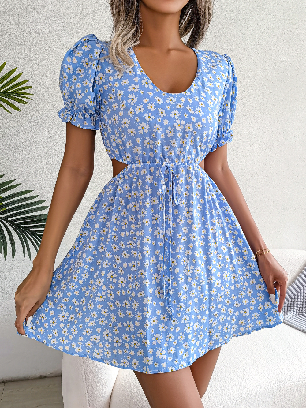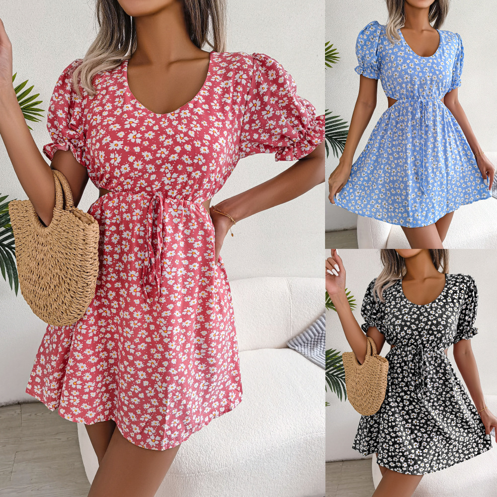 Spring Summer Leisure Hollow Out Cutout out Tied Short Sleeve Floral Dress Women Clothing