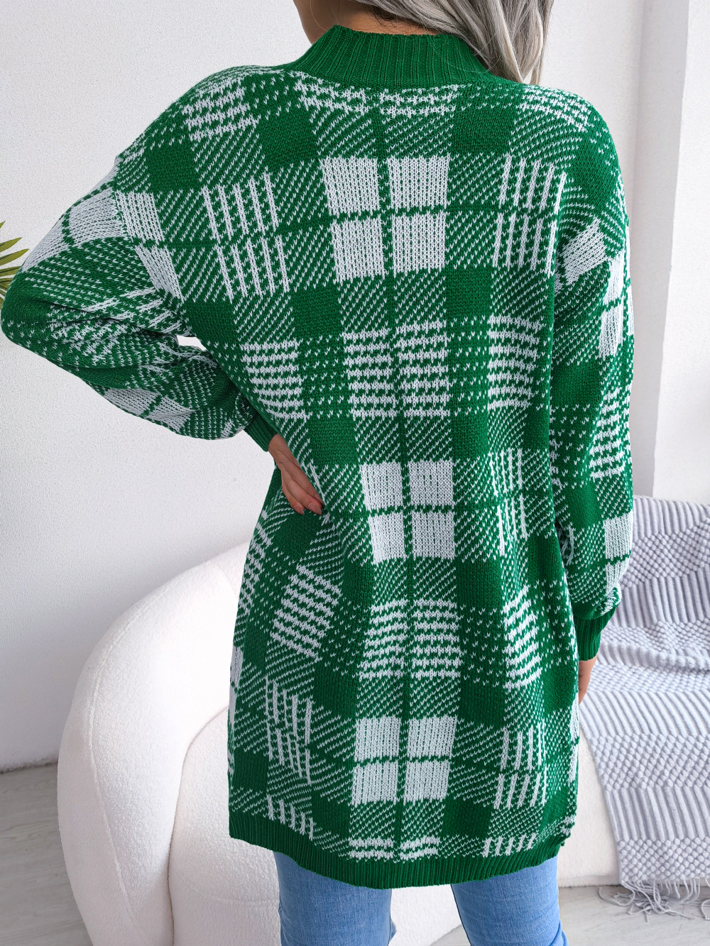 Style Autumn Winter Plaid Lace up Lantern Sleeve Casual Cardigan Sweater Coat Women Clothing