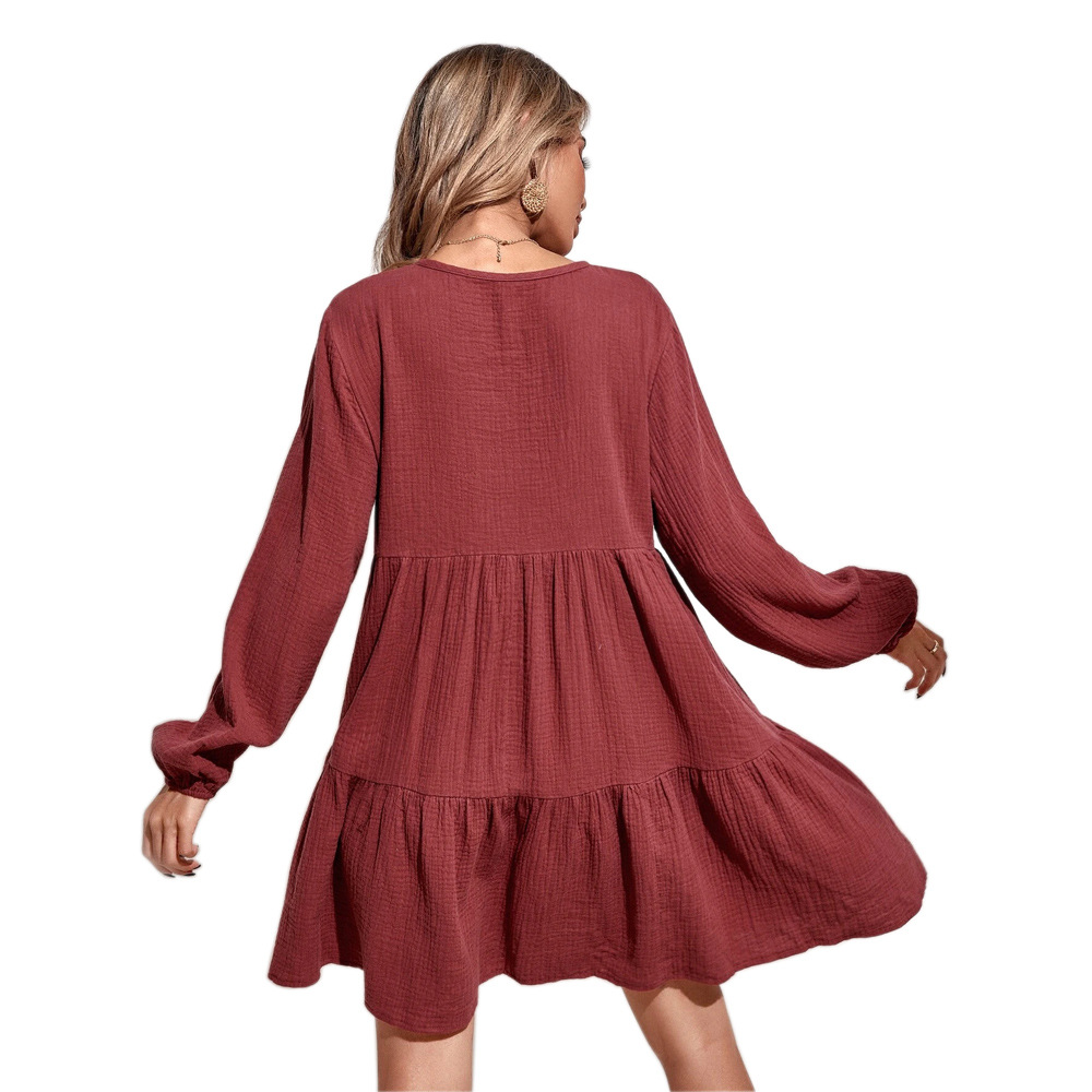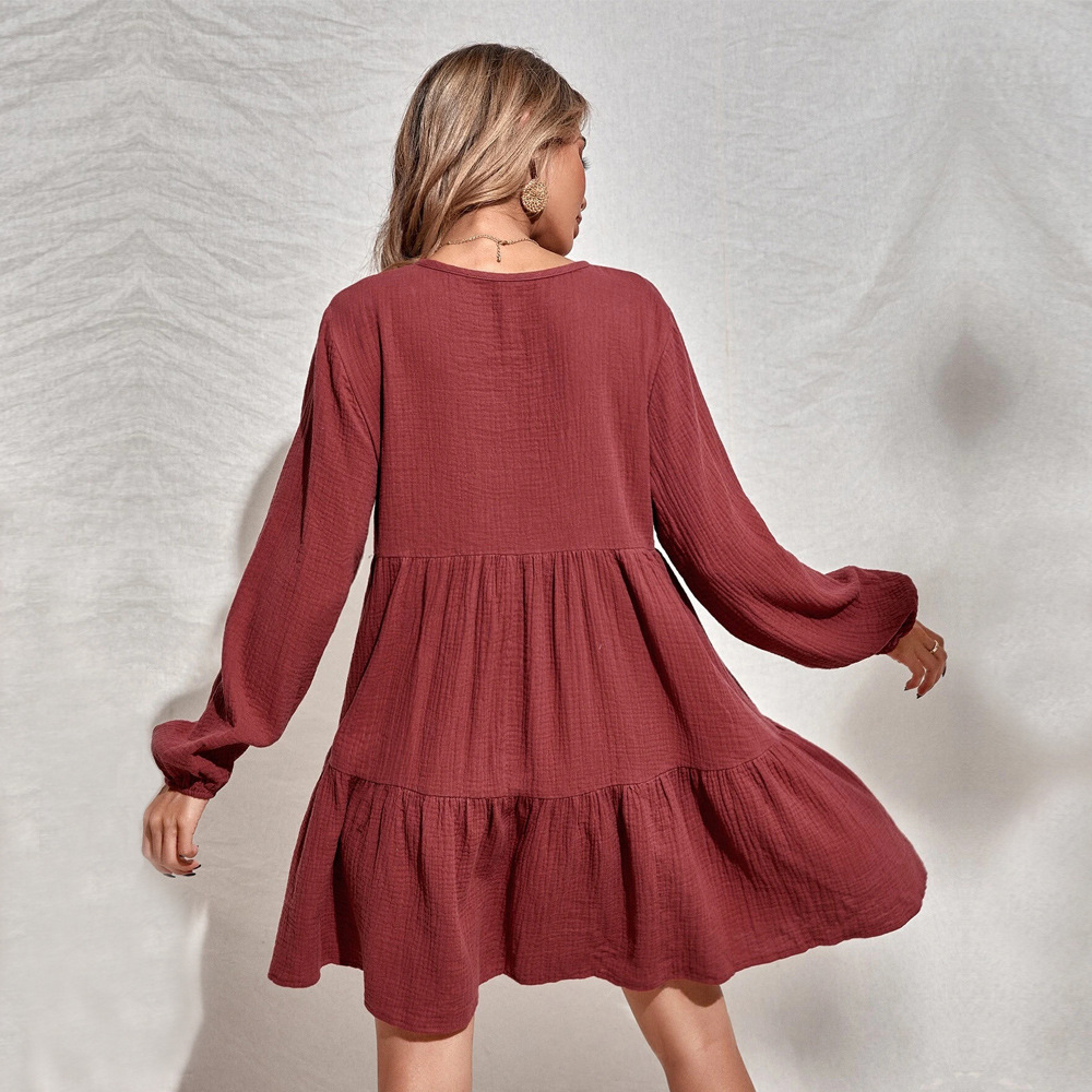 Women Clothing Autumn Winter V-neck Single-Breasted Long Sleeve Solid Color Dress A- line