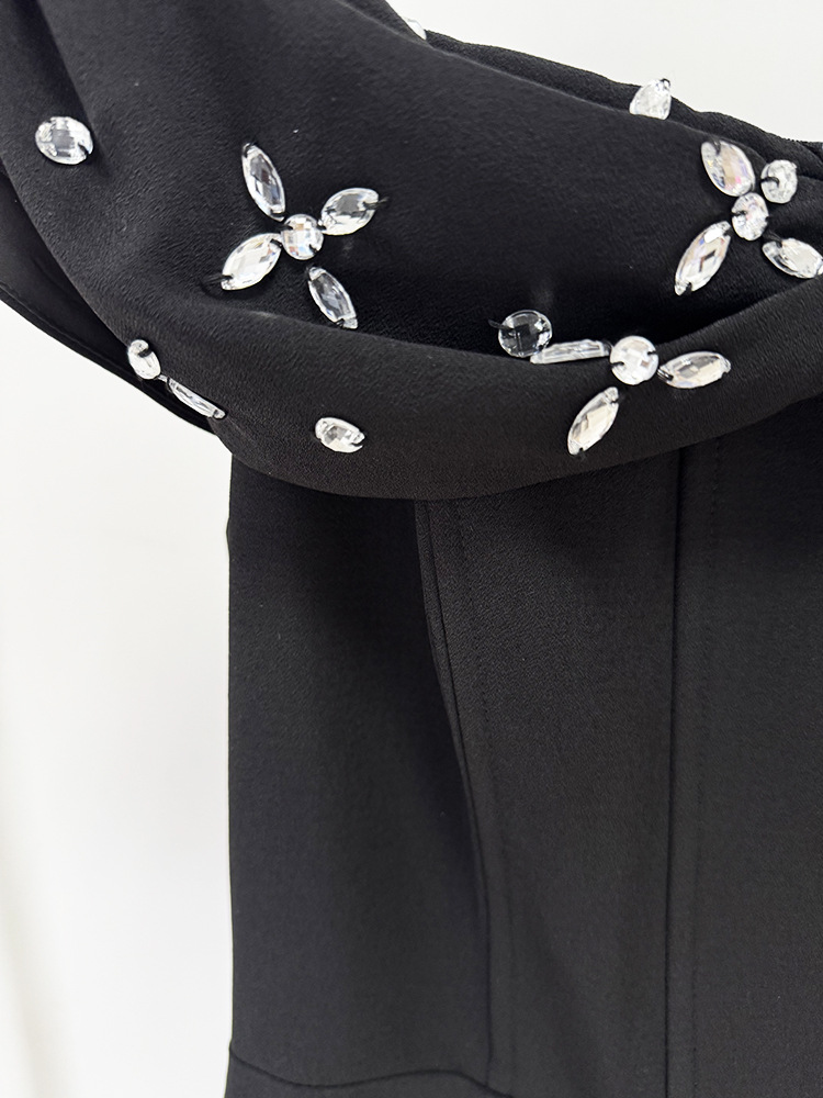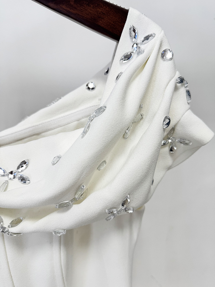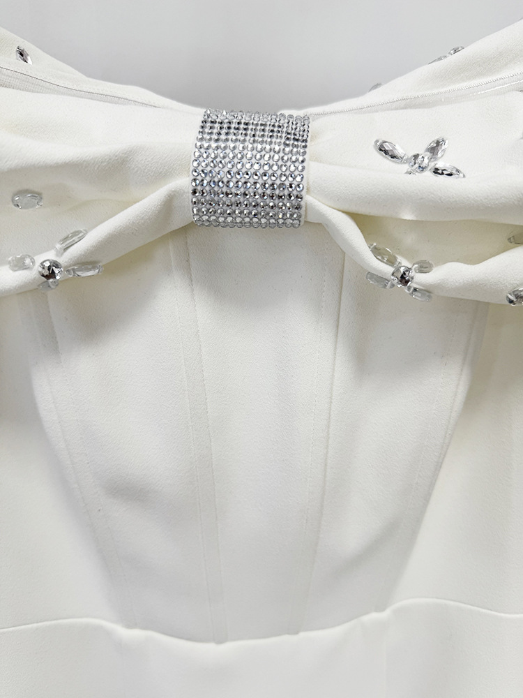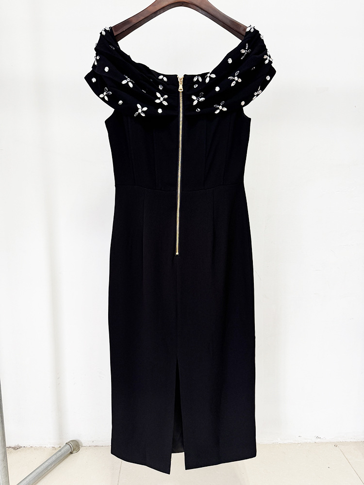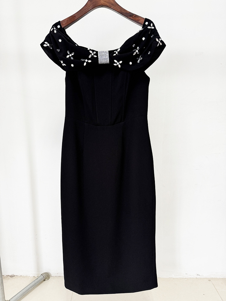 Women Off Shoulder Beads Rhinestones Mid Length Dress